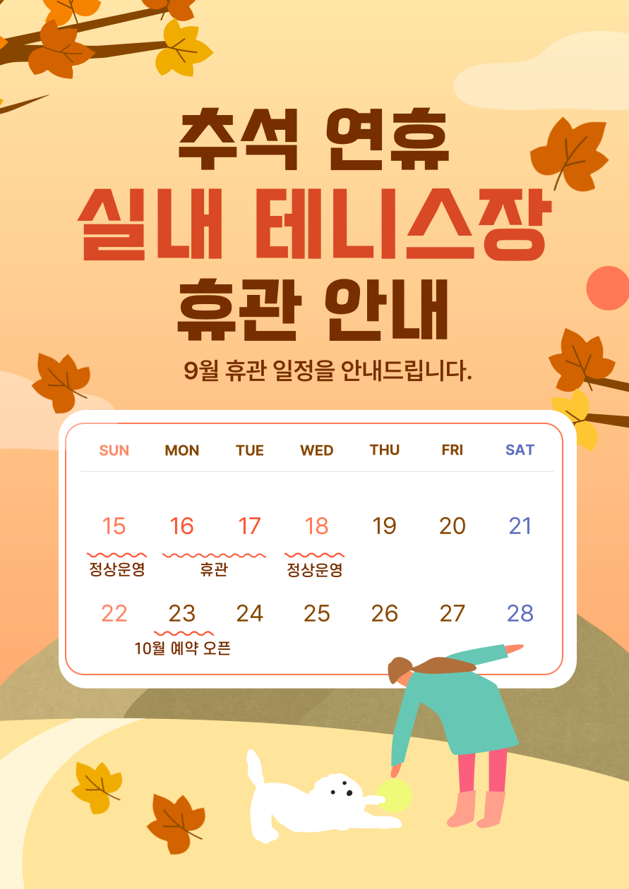 | 19 | 추석 연휴 실내테니스장 휴관 안내 | 2025-09-17 | 261 | ||